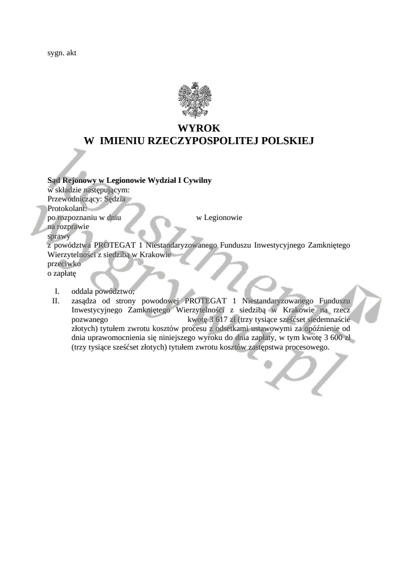 Sąd Rejonowy w Legionowie oddalił powództwo PROTEGAT 1 i nasz Klient został oddłużony na kwotę ponad 30 tysięcy, a doliczając koszty procesu jest to prawie 40 TYSIĘCY ZŁOTYCH, które nie obciążają już naszego Klienta!! Ten wyrok to dowód na to, że PROTEGAT 1 Niestandaryzowany Fundusz Inwestycyjny Zamknięty nie jest taki “straszny” jeżeli podejmiesz profesjonalną obronę przed Sądem!!