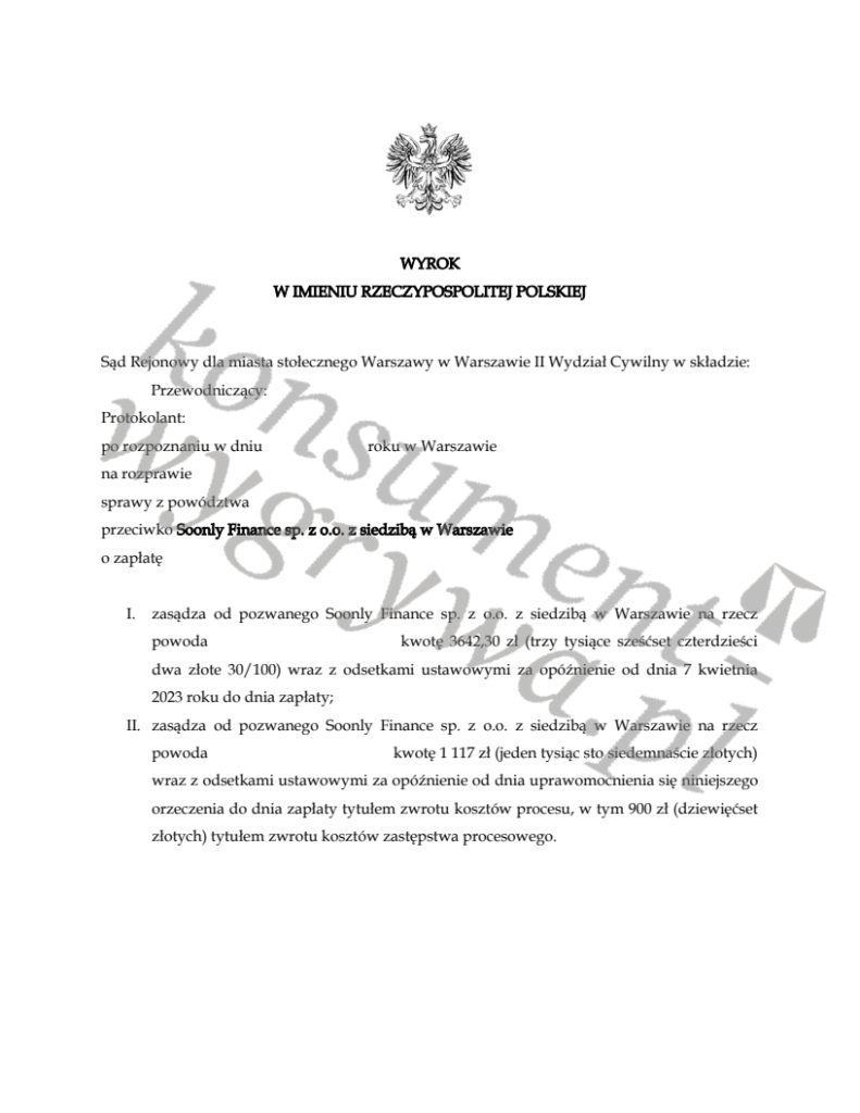 - zasądził od Soonly Finance Sp. z o.o. na rzecz konsumenta ponad 3 tysiące zł,